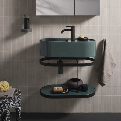 Lavabo de apoyo o suspendido con agujero grifo, sin rebosadero, con un lado no esmaltado. Disponible en varios acabados cerámicos.