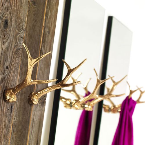 Hubertus es un par de cuernos para colgar en la pared en fundición de latón con acabado pulido. Decididamente fuera de lo común, un objeto bien reconocible se convierte en funcional de forma original. También está disponible en un espejo y en un panel de madera de alerce.