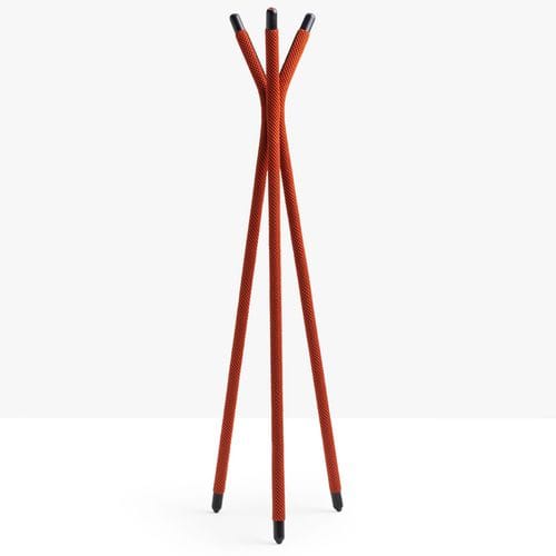 Perchero de tres ganchos tapizado en tela o piel sintética. Pies de acero disponibles en acabado mate o brillante en varios colores a elegir.