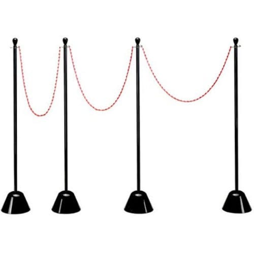 Base de polipropileno pintado negro. Asta de soporte con gancho de acero pintado de negro. Cadena de acero barnizado rojo, de 175 cm de largo.