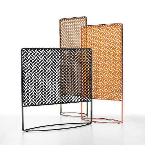 El biombo es un elemento divisorio que permite definir y redefinir espacios, crear nuevos ambientes y rincones reservados para la ocasión, de forma flexible y no definitiva. Nuestro separador de ambientes Sunrise está fabricado con una estructura metálica y una malla de cuero o cuero toscano.