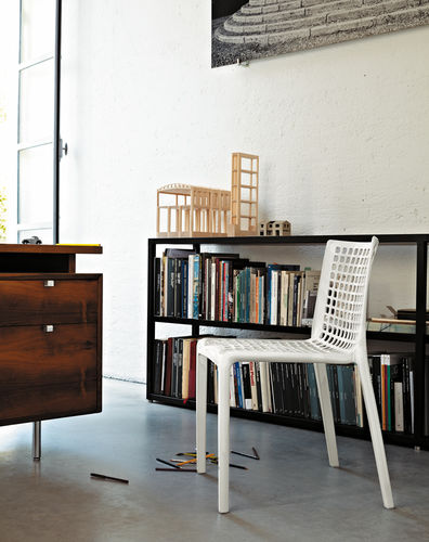 Silla apilable de nylon moldeada con tecnología «air-moulding», también es apta para su uso en exteriores.