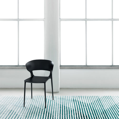 Silla apilable con cuerpo autoportante de poliuretano integral, con armazón de acero. Revestimiento de molde disponible en los diferentes colores en relieve según muestrario. Patas de acero en forma de tubo cónico, de sección cuadrada, lacadas en los mismos colores que el armazón. También apto para exteriores. El taburete (no apilable) tiene las mismas características que la silla.