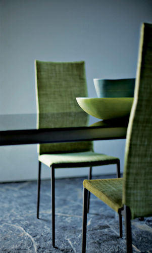 Estructura de aleación de aluminio pulido o barnizado color talco, grafito o negro. Asiento y respaldo acolchados en poliuretano. Tapizado desenfundable de tejido o de piel o no desenfundable de cuero. A pedido suministramos una funda de poner sobre la silla sin fijarla: de tejido 100% algodon, color blanco, disponible corta que cubre asiento y respaldo o larga que cubre tambien las patas.