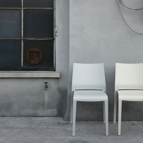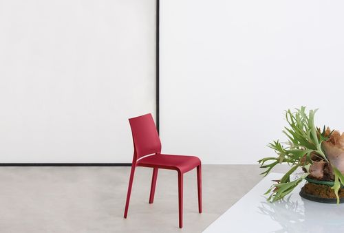 Riga: Silla apilable de polipropileno reforzado con fibra de vidrio estabilizada anti-UV, realizada con tecnología de air moulding, apta para su uso en exteriores.