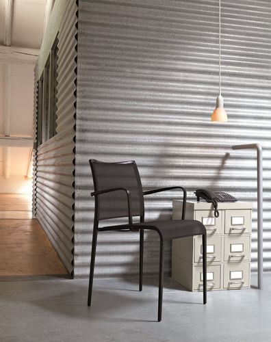 Silla apilable con o sin reposabrazos, estructura de aluminio fundido a presión. Asiento y respaldo de malla de hilo de poliéster recubierto de PVC (Sand Air) y PVC + cáñamo (Sand Air Canatex / Duo) en diferentes colores. También hay versiones lacadas para uso en exteriores