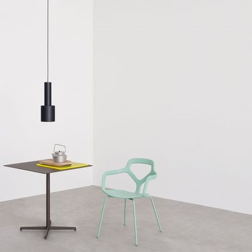 Silla apilable con cuerpo de polímero de ingeniería compuesto de densidad variable. Estructura de acero inoxidable cepillado (también apto para exteriores) o cromado. Versión giratoria con base en forma de cruz de aluminio fundido a presión y tubo de acero. Versión con cojín