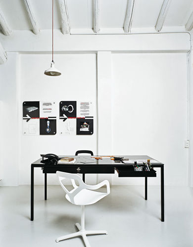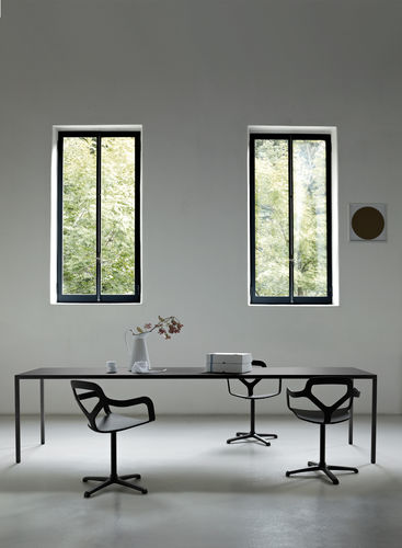 Silla apilable con cuerpo de polímero de ingeniería compuesto de densidad variable. Estructura de acero inoxidable cepillado (también apto para exteriores) o cromado. Versión giratoria con base en forma de cruz de aluminio fundido a presión y tubo de acero. Versión con cojín