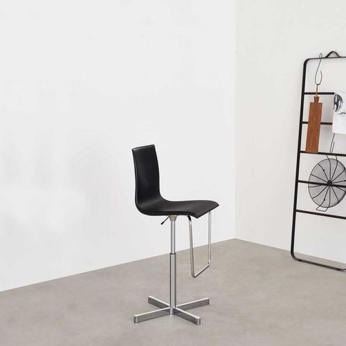 Taburete de bar con cuerpo acrílico, también disponible con revestimiento de ecopiel, cuero y piel de vaca. Estructura giratoria de altura variable, fabricada en aluminio fundido a presión y tubo de acero. Base transversal provista de ruedas esféricas retráctiles, autoblocantes gracias al peso del usuario.