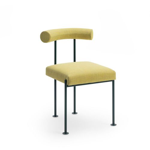 Silla con base metálica de cuatro patas. Asiento y respaldo tapizados en tela, polipiel o piel.