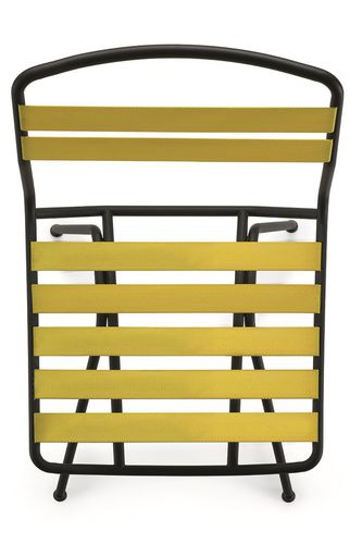 Estructura de acero pintado en los colores gris hierro o negro mate para exteriores. Asiento y respaldo realizados con cintas elásticas de poliéster en los colores amarillo, cuerda, antracita y azul. El logo Zanotta está impreso en la parte posterior de la cinta elastica inferior del respaldo.