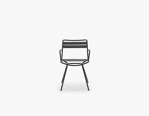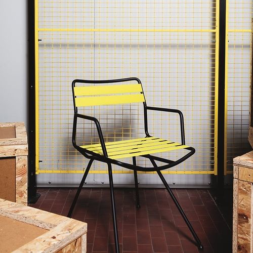 Estructura de acero pintado en los colores gris hierro o negro mate para exteriores. Asiento y respaldo realizados con cintas elásticas de poliéster en los colores amarillo, cuerda, antracita y azul. El logo Zanotta está impreso en la parte posterior de la cinta elastica inferior del respaldo.
