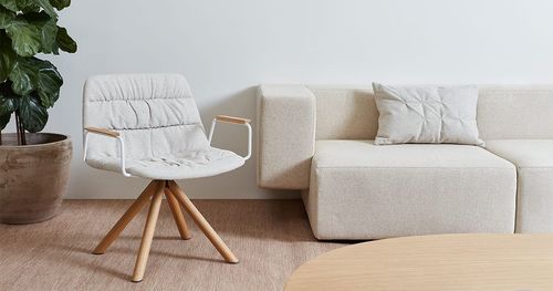 Sillón de diseño con base giratoria, apta para el hogar, la oficina y los espacios híbridos. Víctor Carrasco diseñó la colección Maarten como homenaje al diseñador de muebles belga Maarten Van Severen.