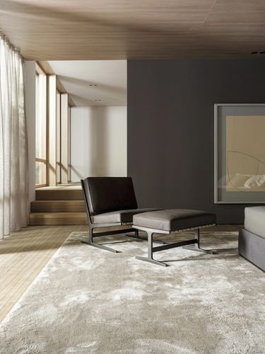 La otomana a juego se concibió como una continuación a nivel visual del sillón. Su base está formada por los mismos pies de pedestal en metal fumé o arena y su cojín está sujeto con el mismo sistema de correas de cuero en bucle.