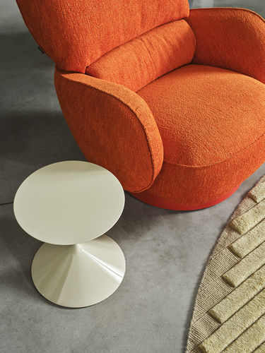 Base giratoria pintada brillante en los colores talco, cáñamo, naranja, alga, granate y negro. Armazón de acero, acolchado de espuma de poliuretano autoextinguible con polioles de origen vegetale. Cojín de respaldo acolchado de fibra PET reciclada. Tapizado desenfundable en tejido. El sillón está equipado con un mecanismo sincronizado integrado y regulable, oculto en el interior del asiento, que permite bascular o bloquear el respaldo en cualquier posición.
