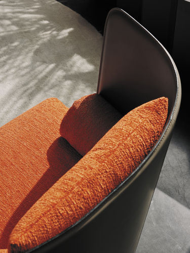 Respaldo en madera contrachapada recubierta en cuero pigmentato 90 o cuero 95. No realizable en cuero 95 color blanco 0704 y cuero pigmentato 90, blanco 0800. Asiento en poliuretano a densidades diferenciadas/ copos de poliéster regenerado y regenerable; cojín respaldo y cojín lumbar en copos de poliéster regenerado y regenerable. Tapizado desenfundable de tejido. Sobre pedido se puede hacer el cojín de respaldo en un color diferente dentro del mismo tipo de tejido.