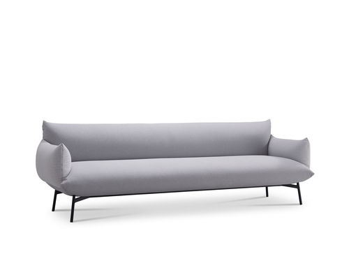 Sofá de tres plazas con patas de metal pintado. Asiento y respaldo tapizados en tela. El sofá Area también está disponible en la versión sin reposabrazos.