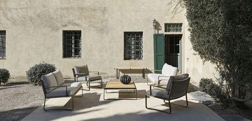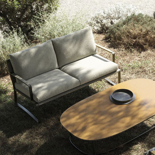La Colección Timeout se caracteriza por la banda de aluminio pintado bruñido que enmarca todos los perfiles del mueble como una cinta, redondeándose en las esquinas y creando así, en un trazo continuo, el soporte del asiento, los reposabrazos y los pies de apoyo. Estos últimos, vistos de perfil, parecen esbeltos y ligeros, dando sensación de dinamismo.