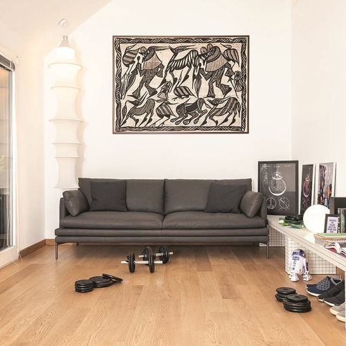 Patas de aleación de aluminio pulido o niquelado mate en los acabados natural o negro, o pintado negro. Estructura de acero. Suspensión sobre cintas elásticas. Acolchado de poliuretano/fibra poliéster termounida. Cojínes asiento, respaldo y apoyabrazo de pluma de ganso. Tapizado desenfundable de tejido o de piel. Las butacas alargadas sin apoyabrazos y los sofás modulare se preparan para fijar una repisa en madera maciza de roble pintado color