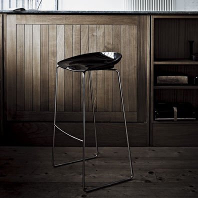 Taburete con asiento en nylon blanco brillante o negro brillante. Taburete con estructura en varilla de acero cromado o lacado.